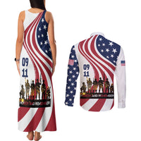 911 Memorial Couples Matching Tank Maxi Dress and Long Sleeve Button Shirt Patriot Day American Flag and Soldier Silhouette Honor and Remember TS04