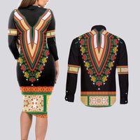 Africa Dashiki Couples Matching Long Sleeve Bodycon Dress and Long Sleeve Button Shirt Embroidery Neckline Floral Pattern LT18