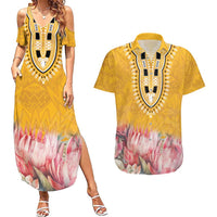 Africa Dashiki Couples Matching Summer Maxi Dress and Hawaiian Shirt King Protea Floral Motif Patterns