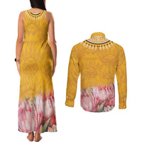 Africa Dashiki Couples Matching Tank Maxi Dress and Long Sleeve Button Shirt King Protea Floral Motif Patterns