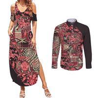 Africa Floral mix Maasai Shuka Couples Matching Summer Maxi Dress and Long Sleeve Button Shirt Red Moitf