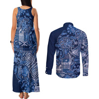 Africa Floral mix Maasai Shuka Couples Matching Tank Maxi Dress and Long Sleeve Button Shirt Blue Moitf