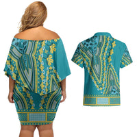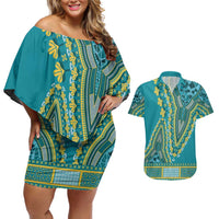 African Dashiki Couples Matching Off Shoulder Short Dress and Hawaiian Shirt Luxury Teal
