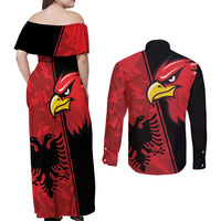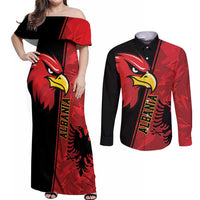 Albania Eagle Couples Matching Off Shoulder Maxi Dress and Long Sleeve Button Shirt National Emblem Grunge Pattern