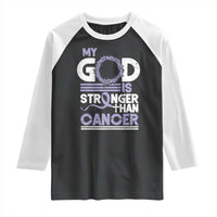 All Cancer Awareness Raglan Shirt My God Is Stronger Than Cancer Lavender Ribbon TS11