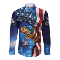 American Flag Bass Fishing Graphic Long Sleeve Button Shirt Patriotic Fish and Starry Galaxy Background