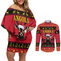 Angola Christmas Couples Matching Off Shoulder Short Dress and Long Sleeve Button Shirt Giant Sable Antelope Virtus Unita Fortior