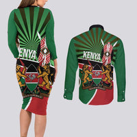 Athletics Kenya Couples Matching Long Sleeve Bodycon Dress and Long Sleeve Button Shirt Maasai Shield Running Way LT14