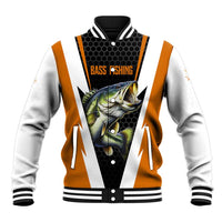 Bass Fishing Baseball Jacket Jumping Largemouth Fish on Black Hex Pattern and Orange White Lightning Accents TS04
