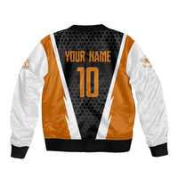 Bass Fishing Bomber Jacket Jumping Largemouth Fish on Black Hex Pattern and Orange White Lightning Accents