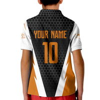 Bass Fishing Kid Polo Shirt Jumping Largemouth Fish on Black Hex Pattern and Orange White Lightning Accents TS04