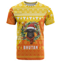 Bhutan Christmas T Shirt with Takin Reindeer Antlers Santa Hat and Yellow Orange Holiday Pattern