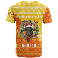 Bhutan Christmas T Shirt with Takin Reindeer Antlers Santa Hat and Yellow Orange Holiday Pattern TS04
