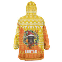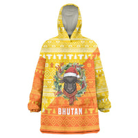 Bhutan Christmas Wearable Blanket Hoodie with Takin Reindeer Antlers Santa Hat and Yellow Orange Holiday Pattern