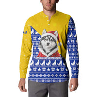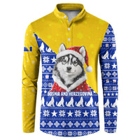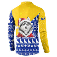 Bosnia and Herzegovina Christmas Button Sweatshirt with Husky Dog Santa Hat and Blue Yellow Snowflake Pattern