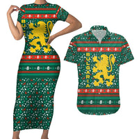 Bulgaria Christmas Couples Matching Short Sleeve Bodycon Dress and Hawaiian Shirt with Green-Red Theme, Golden Lion, and Santa Sleigh Motif TS04