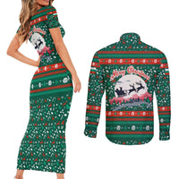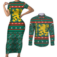 Bulgaria Christmas Couples Matching Short Sleeve Bodycon Dress and Long Sleeve Button Shirt with Green-Red Theme, Golden Lion, and Santa Sleigh Motif TS04
