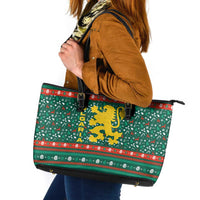 Bulgaria Christmas Leather Tote Bag with Green-Red Theme, Golden Lion, and Santa Sleigh Motif TS04