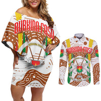 Burkina Faso Couples Matching Off Shoulder Short Dress and Long Sleeve Button Shirt with Brown White Yellow Abstract Design
