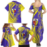Campione d’Italia Family Matching Summer Maxi Dress and Hawaiian Shirt with Yellow Horse Graphic and Purple Flame Crest
