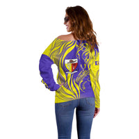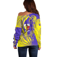 Campione d’Italia Off Shoulder Sweater with Yellow Horse Graphic and Purple Flame Crest