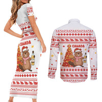 Canada Christmas Couples Matching Short Sleeve Bodycon Dress and Long Sleeve Button Shirt with Beaver Maple Tree Ice Wine Pie and Red White Knit Pattern Design