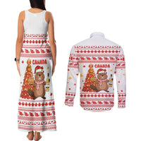 Canada Christmas Couples Matching Tank Maxi Dress and Long Sleeve Button Shirt with Beaver Maple Tree Ice Wine Pie and Red White Knit Pattern Design