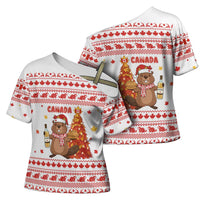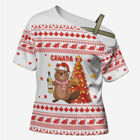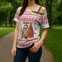 Turn heads and express your unique style with the Canada Christmas Cross Shoulder Shirt with Beaver Maple Tree Ice Wine Pie and Red White Knit Pattern Design from Wonder Print Shop. Perfect for casual outings, festivals, or making a fashion statement, this custom-made cross shoulder shirt combines high-end craftsmanship with eye-catching design.