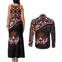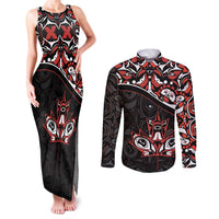 Canada Day Couples Matching Tank Maxi Dress and Long Sleeve Button Shirt Haida Maple Leaf Style Tattoo Black