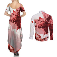 Canada Flag Couples Matching Summer Maxi Dress and Long Sleeve Button Shirt Caribou Design with National Symbol TS04