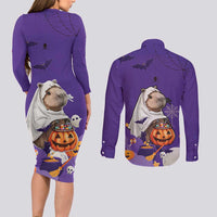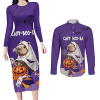 Capy-Boo-Ra Halloween Couples Matching Long Sleeve Bodycon Dress and Long Sleeve Button Shirt Bats And Pumpkins Funny Style