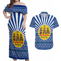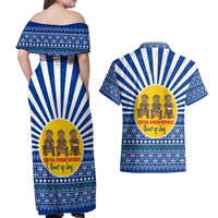 Central African Republic Christmas Couples Matching Off Shoulder Maxi Dress and Hawaiian Shirt with Drumming Kids Beat of Joy Tribal Pattern and Snowflakes