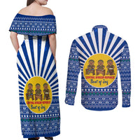 Central African Republic Christmas Couples Matching Off Shoulder Maxi Dress and Long Sleeve Button Shirt with Drumming Kids Beat of Joy Tribal Pattern and Snowflakes