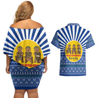Central African Republic Christmas Couples Matching Off Shoulder Short Dress and Hawaiian Shirt with Drumming Kids Beat of Joy Tribal Pattern and Snowflakes