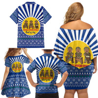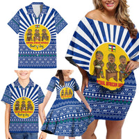 Central African Republic Christmas Family Matching Off Shoulder Short Dress and Hawaiian Shirt with Drumming Kids Beat of Joy Tribal Pattern and Snowflakes