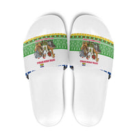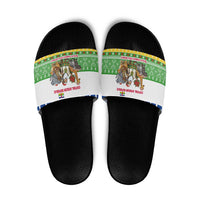 Ready to own your look? Order your pair of Central African Republic Christmas Slide Sandals with Santa and Safari Animals Baobab Trees Snowflakes and Tribal Pattern today and walk in confidence.