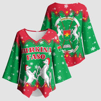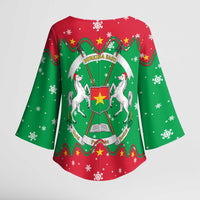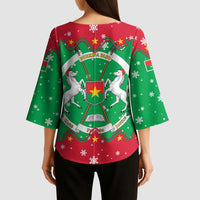 Add a chic touch to your wardrobe with the Christmas Burkina Faso Kimono Sleeve Blouse Snowflake Horses and Coat of Arms from Wonder Print Shop. Designed for versatility, this V-neck blouse features flowing kimono-style sleeves and a relaxed fit — perfect for both casual and dressy occasions. Crafted with premium polyester fabric, it offers a soft, lightweight feel for all-day comfort.