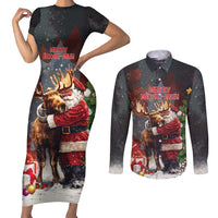 Christmas Canada Couples Matching Short Sleeve Bodycon Dress and Long Sleeve Button Shirt Merry Moose-Mas Santa Hugging A Moose