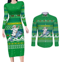 Comoros Christmas Couples Matching Long Sleeve Bodycon Dress and Long Sleeve Button Shirt with Santa Riding Dolphin Ocean Waves Crescent Moon and Tribal Pattern