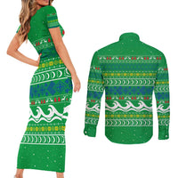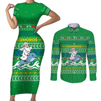 Comoros Christmas Couples Matching Short Sleeve Bodycon Dress and Long Sleeve Button Shirt with Santa Riding Dolphin Ocean Waves Crescent Moon and Tribal Pattern