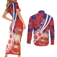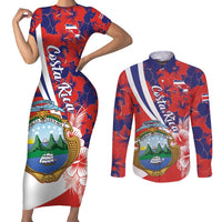 Costa Rica Couples Matching Short Sleeve Bodycon Dress and Long Sleeve Button Shirt Coat of Arms Hibiscus Pattern