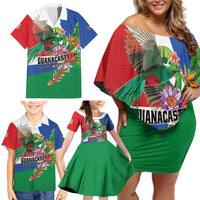 Costa Rica Guanacaste Day Family Matching Off Shoulder Short Dress and Hawaiian Shirt Resplendent Quetzal Tropical Flowers