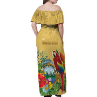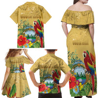 Costa Rica Independence Day Family Matching Off Shoulder Maxi Dress and Hawaiian Shirt Scarlet Macaw Parrot Tropical Flowers