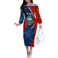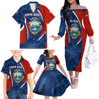 Costa Rica Orchid Family Matching Off The Shoulder Long Sleeve Dress and Hawaiian Shirt Red and Blue with National Emblem and Purple Flower Design