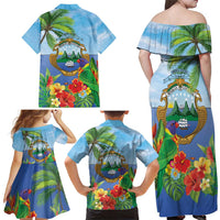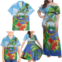 Costa Rica Parrot Tropical Flowers Family Matching Off Shoulder Maxi Dress and Hawaiian Shirt