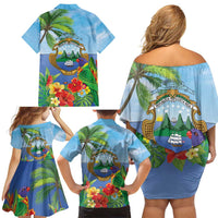 Costa Rica Parrot Tropical Flowers Family Matching Off Shoulder Short Dress and Hawaiian Shirt