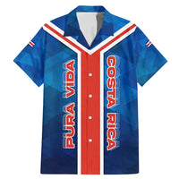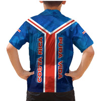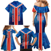 Costa Rica Pura Vida Family Matching Mermaid Dress and Hawaiian Shirt Blue Geometric with Red Stripe and National Flag Detail