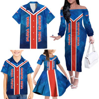Costa Rica Pura Vida Family Matching Off The Shoulder Long Sleeve Dress and Hawaiian Shirt Blue Geometric with Red Stripe and National Flag Detail