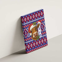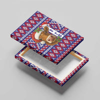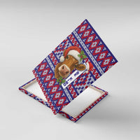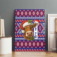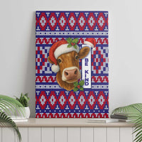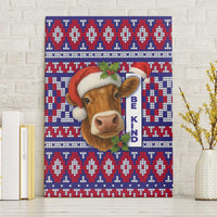 Cow in Santa Hat Be Kind Message Canvas Wall Art with Red Blue Knit Pattern Design