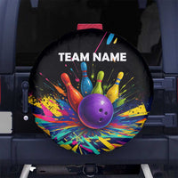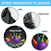 Custom Bowling Strike Design Spare Tire Cover Colorful Pins and Purple Ball in Abstract Splatter Art Style